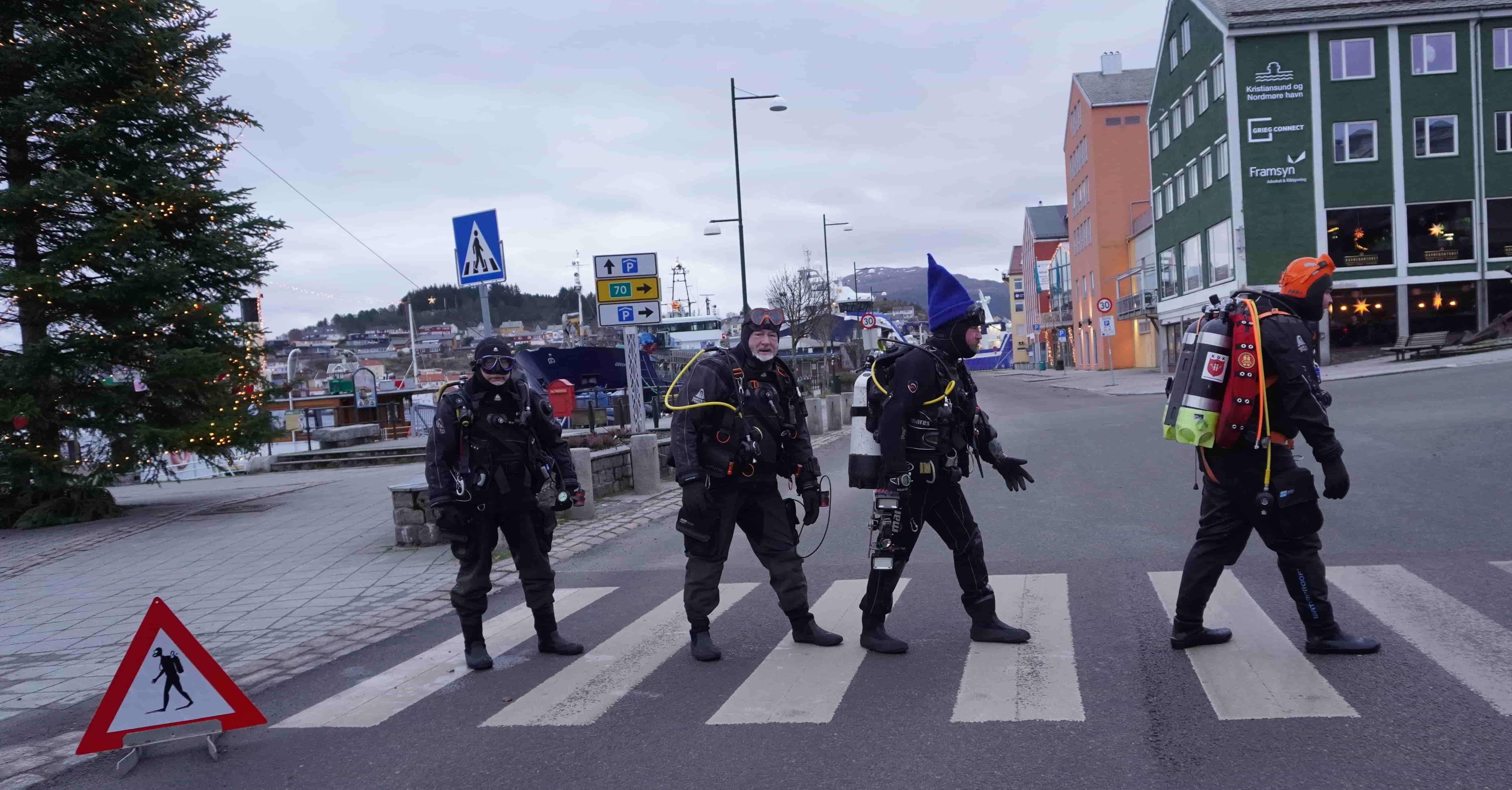 Se abonnementTradisjonen tro stiller dykkerne fra Kristiansund Dykkerklubb opp ved piren første juledag for å ta seg et dykk og brenne vekk litt juleribbe-kalorier. I år stiller de opp for et homage til et ikonisk bilde av Beatles sitt Abbey Road album cover. Fotgjengerovergangen ved Sundbåtpiren blir målet, med varselsskilt "Advarsel– Dykker i veien". I Kristiansund sentrum er gatene stort sett tomme, med noen få spaserende i området. Det er julefred i nordmørsbyen.