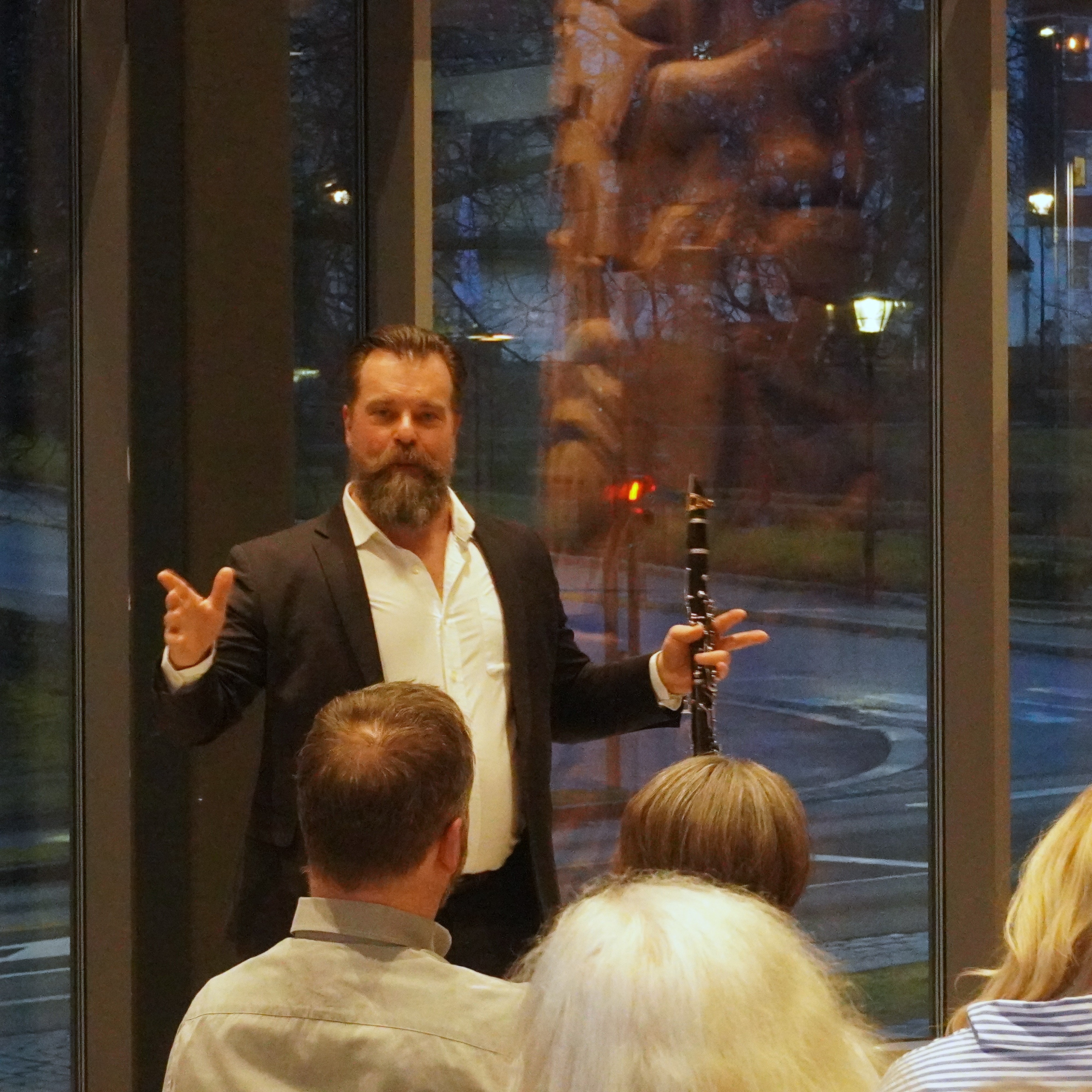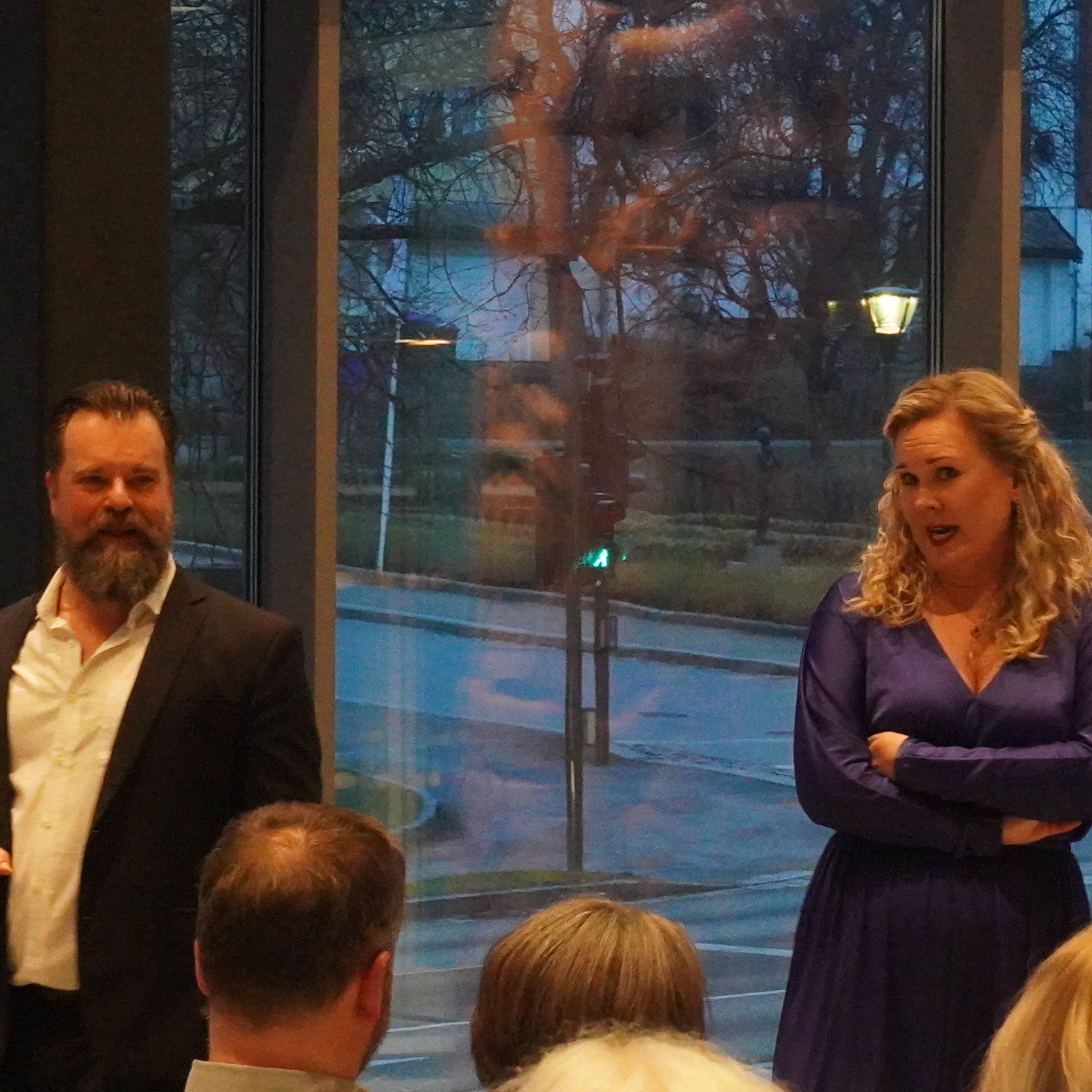 Stina presenterte deretter «Rosalkas sang til månen» på tsjekkisk, før Trond grep klarinetten og tok oss med inn i Spellemann på taket. Kvelden ble videre beriket med en blanding av opera på italiensk og folk og røvere på klingende «Egnersk».