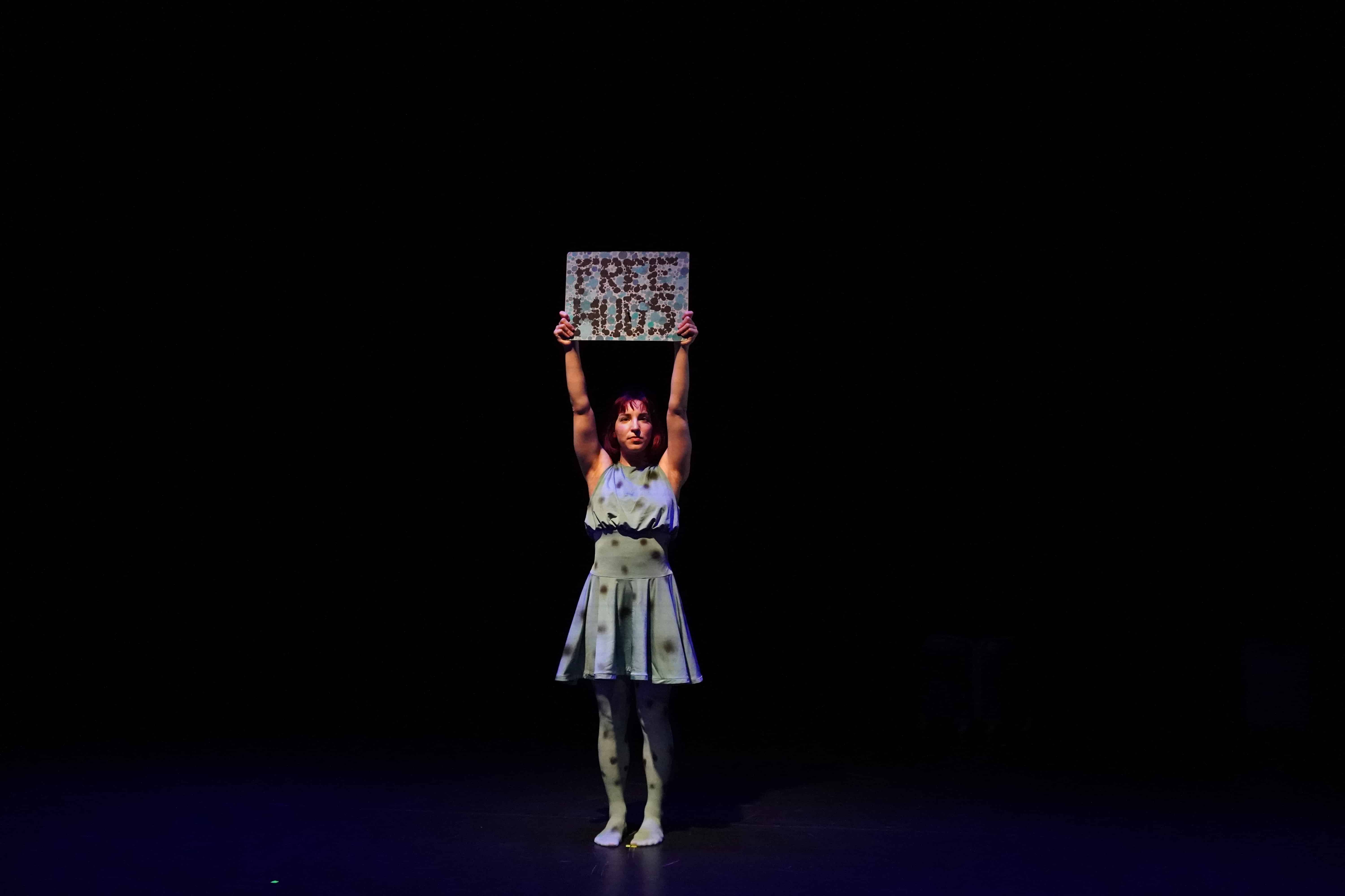 I forestillingen er fysisk nærhet et gjennomgående motiv. «Free hugs»-skiltet fungerer som et tydelig symbol. «Free hugs», eller var det «Free will»? Et skilt har to sider, men er det to sider av samme sak?
