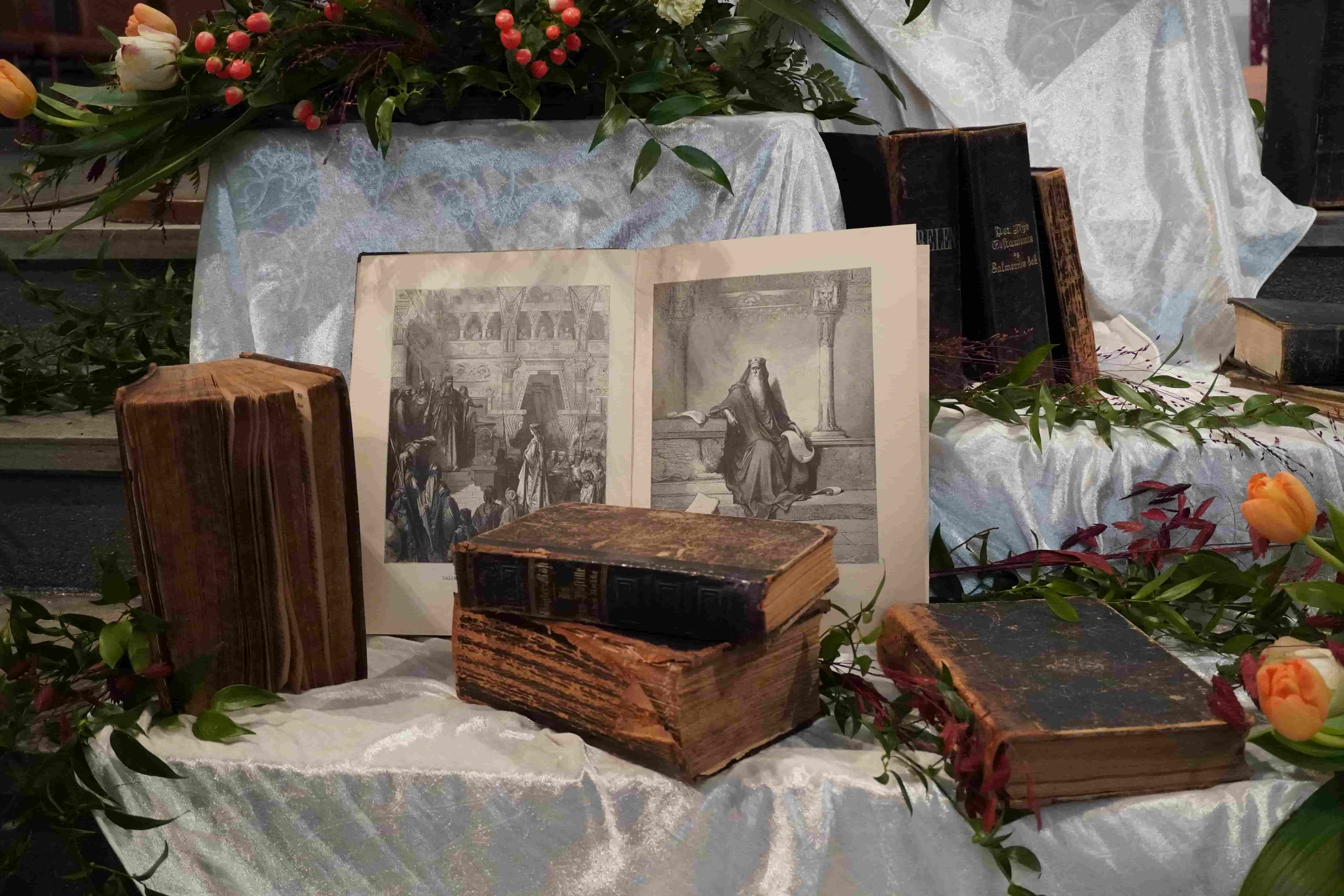I Kirkelandet kirke ble dette også formidlet visuelt. Myra Blomst hadde utformet en blomsterdekorasjon der gamle bibler inngikk som en del av installasjonen foran i kirkerommet. Dekorasjonen fungerte både som symbol og som konkret påminnelse om Bibelens lange historie og fysiske tilstedeværelse i kirkelig praksis.