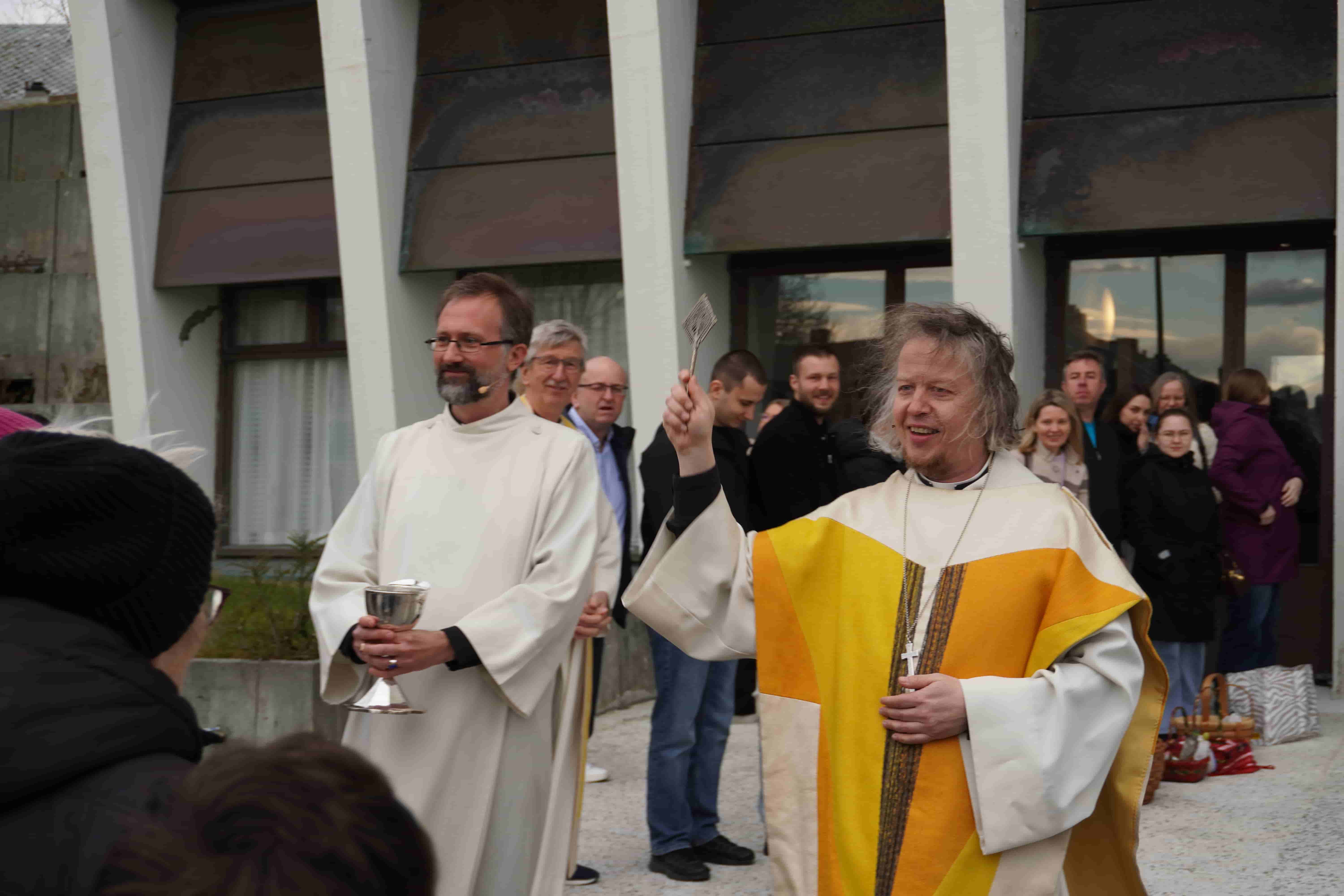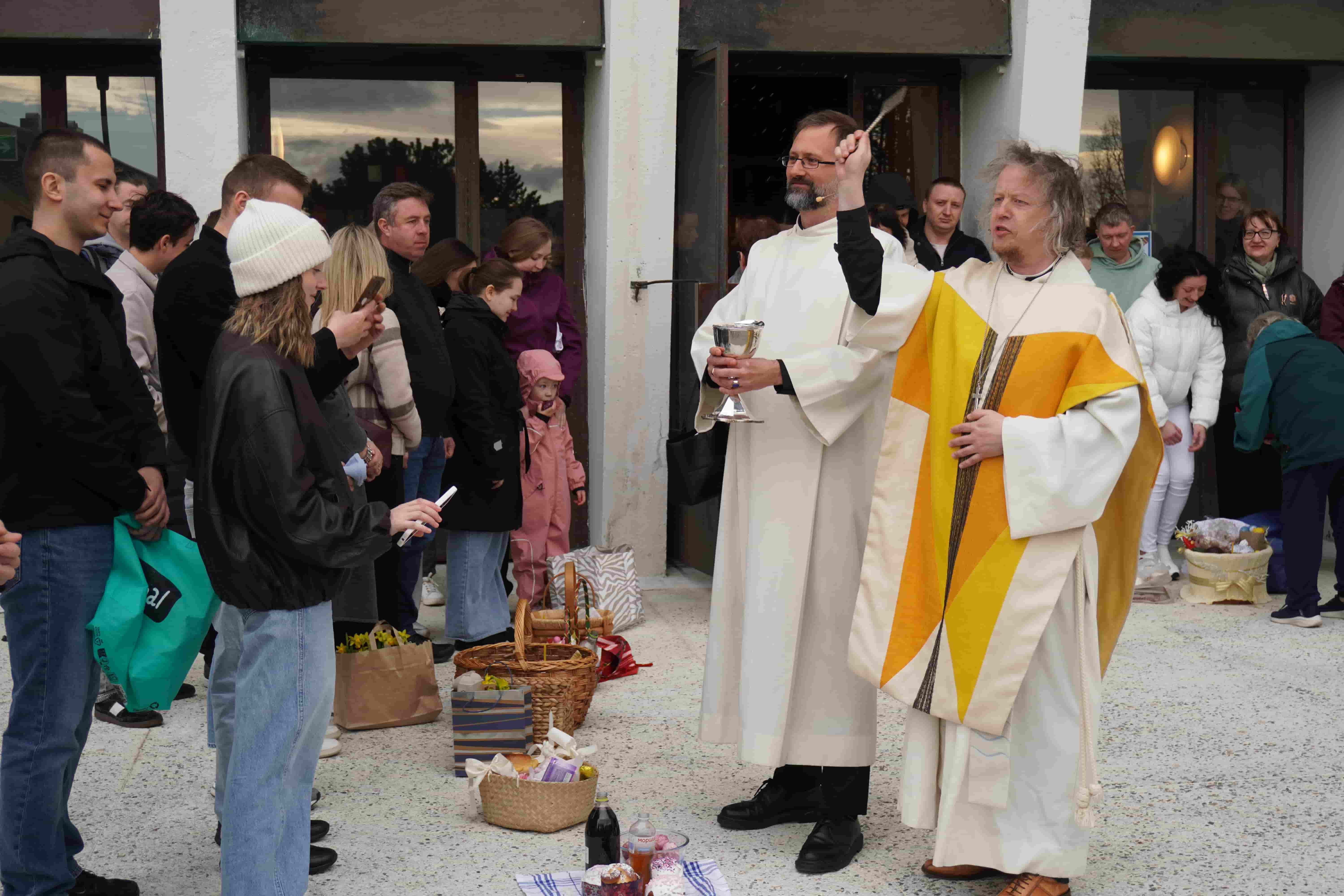 Med bilder og video: Søndag 12. april ble det feiret gudstjeneste i Kirkelandet kirke med en litt uvanlig utvidelse av det liturgiske rommet. Den norske høymessen ble gjennomført i sin kjente form, men med innslag fra ortodoks påsketradisjon med tekstlesning på ukrainsk og en etterfølgende velsignelse av mat utenfor kirken.