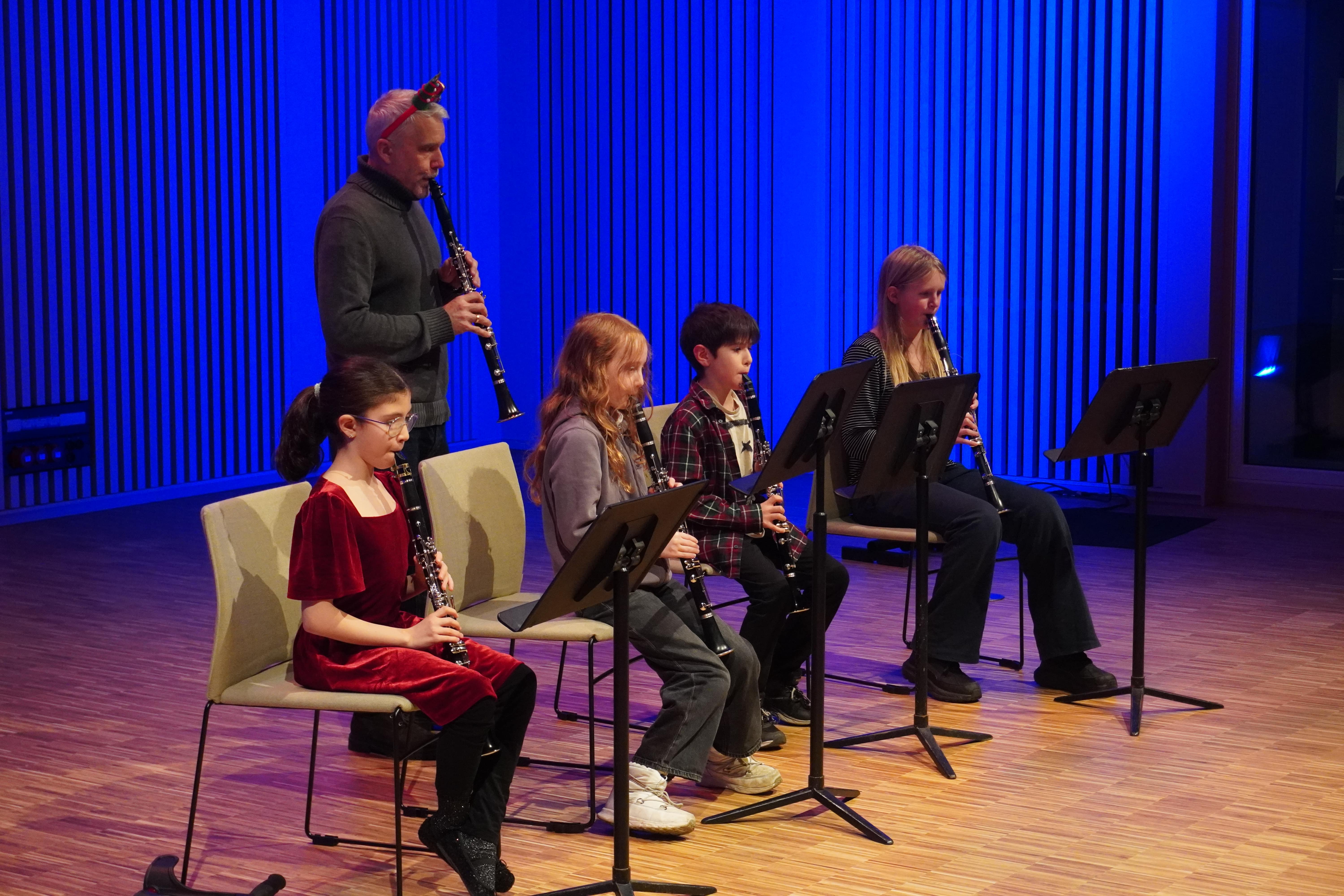 Med alle fire Elever på sine klarinetter fikk vi en flott versjon av «Deilig er jorden». Det er gledelig å se hva elevene klarer å fremføre etter en time med å øve på melodien. Publikum ble oppfordret til å synge med.