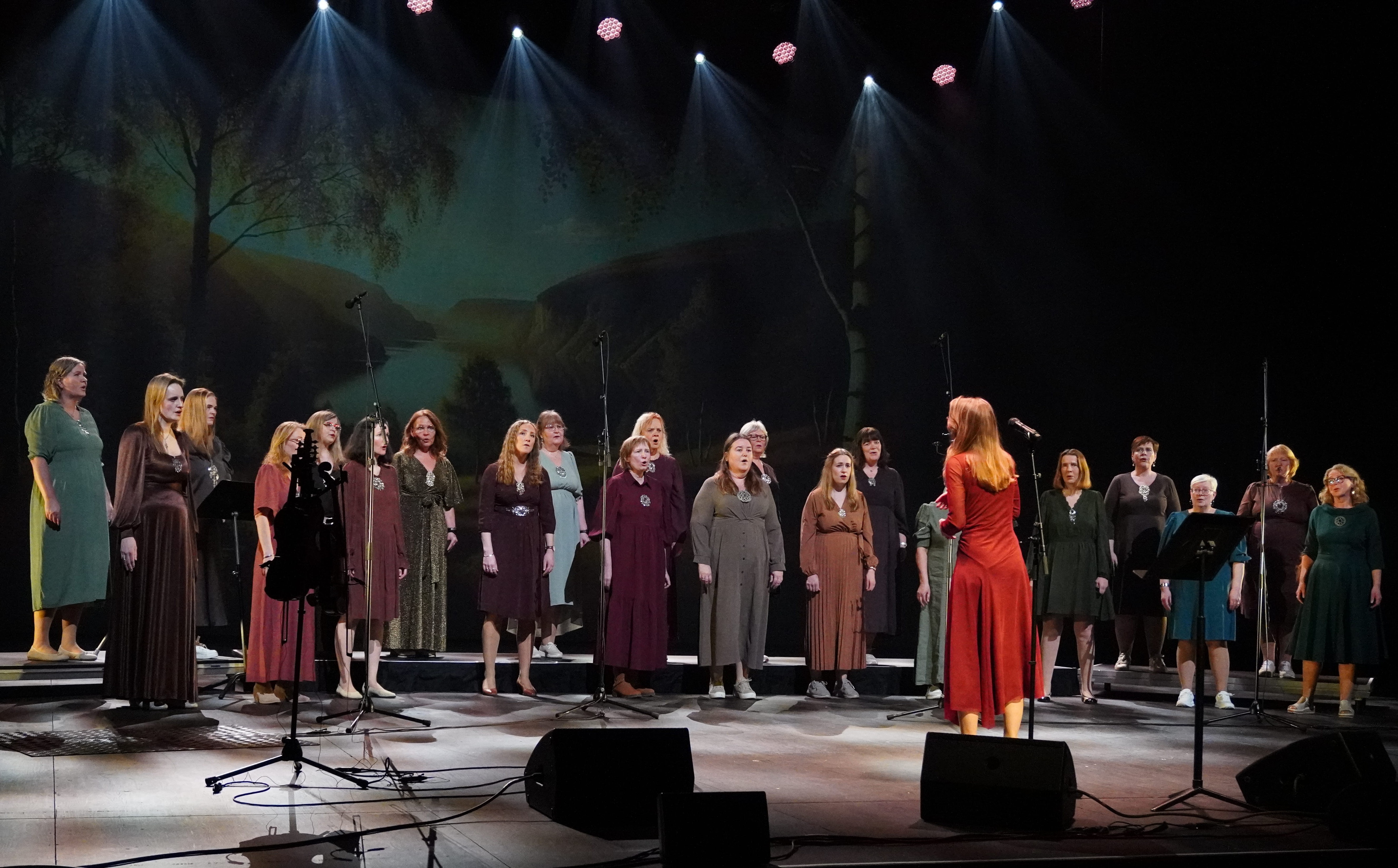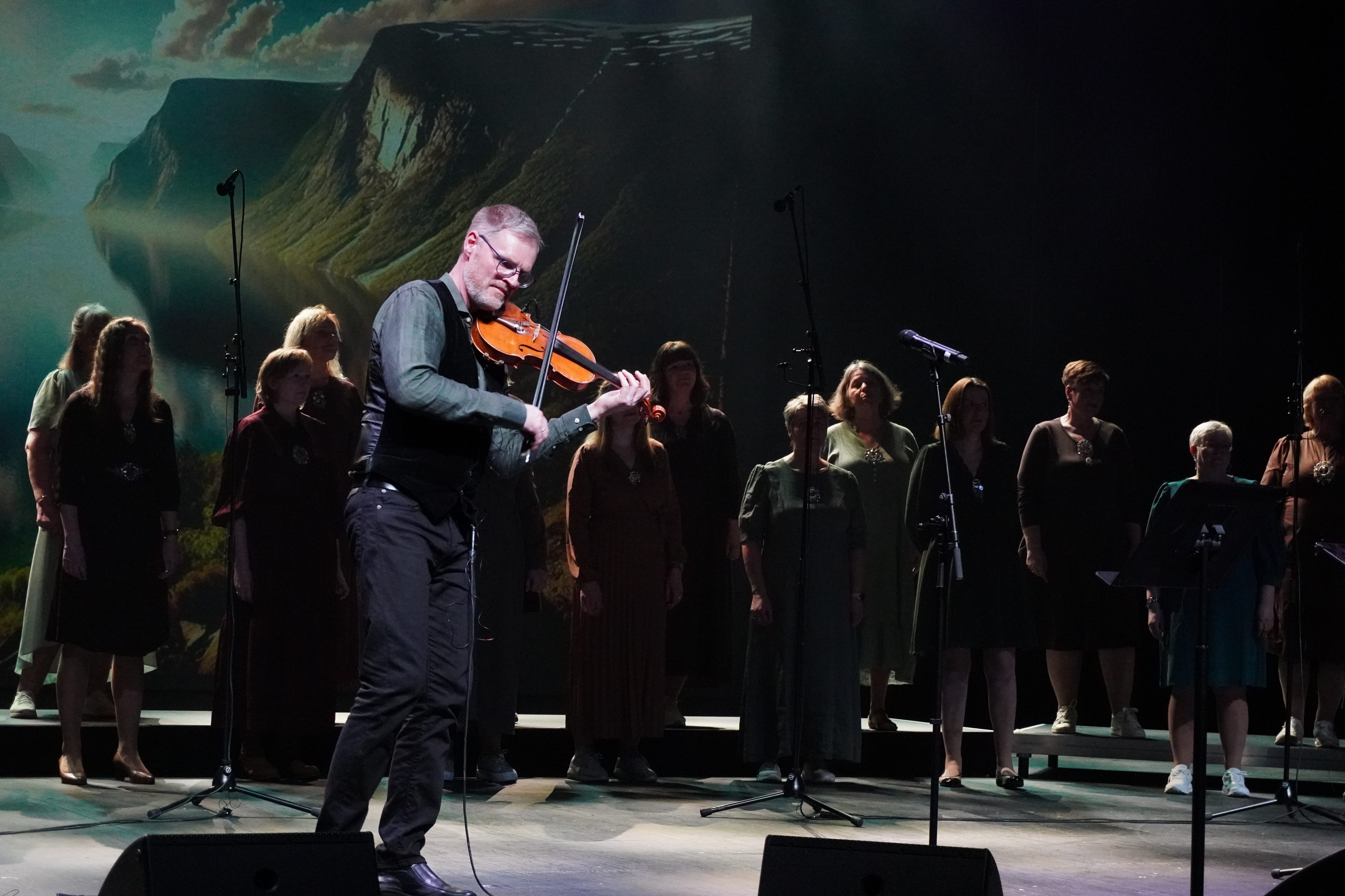 Dirigent Rannveig Eikrem ønsket publikum velkommen og innledet med å beskrive den dypeforbindelsen mellom folketonene og naturen, noe som ble tydeliggjort i det vakre scenebakgrunnen som skapte refleksjoner til blant andre August Cappelens malerier.